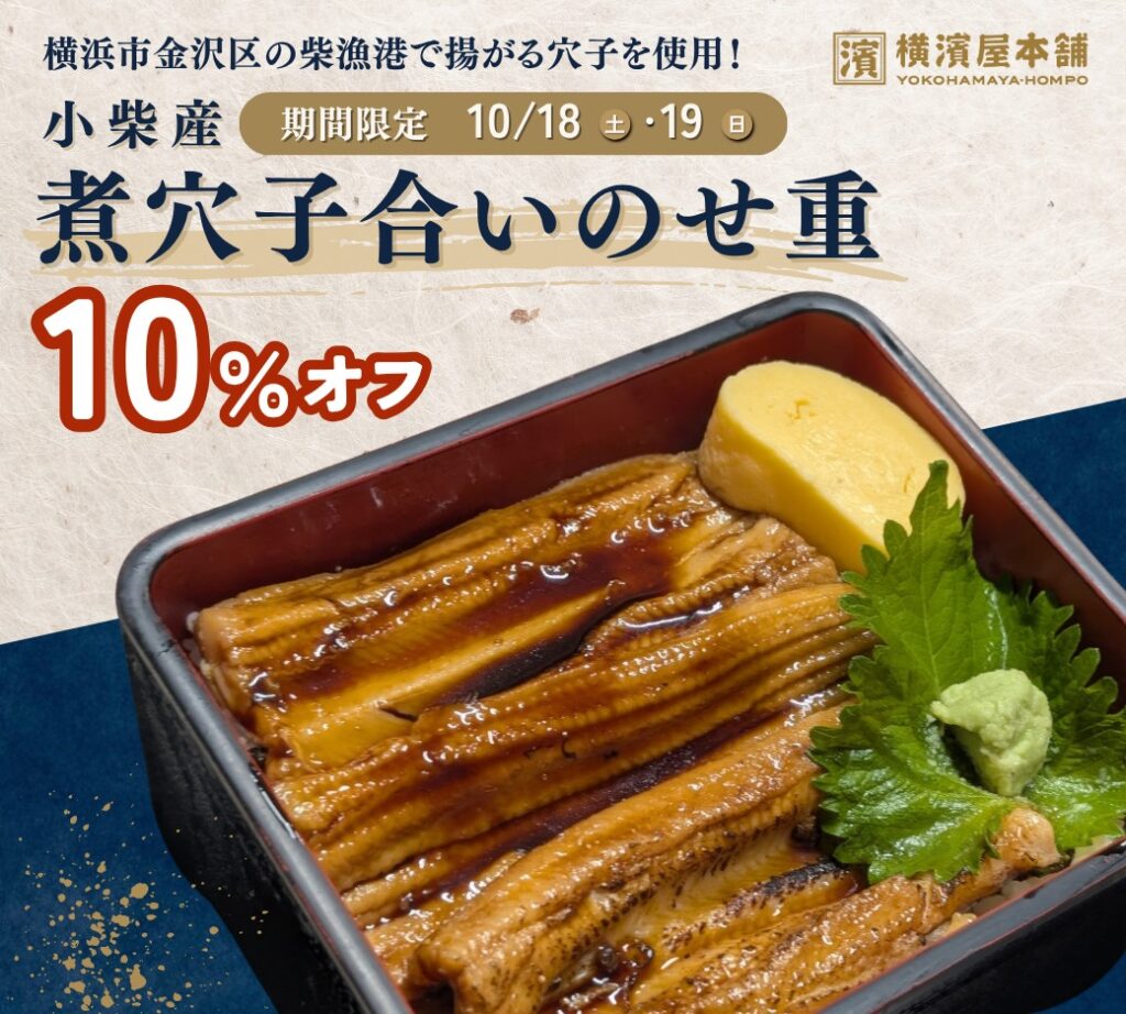 📆10/18(土)、10/19(日)の二日間限定!8月から提供中の『小柴産 特選煮穴子合いのせ重』を10%オフでご提供いたします✨
