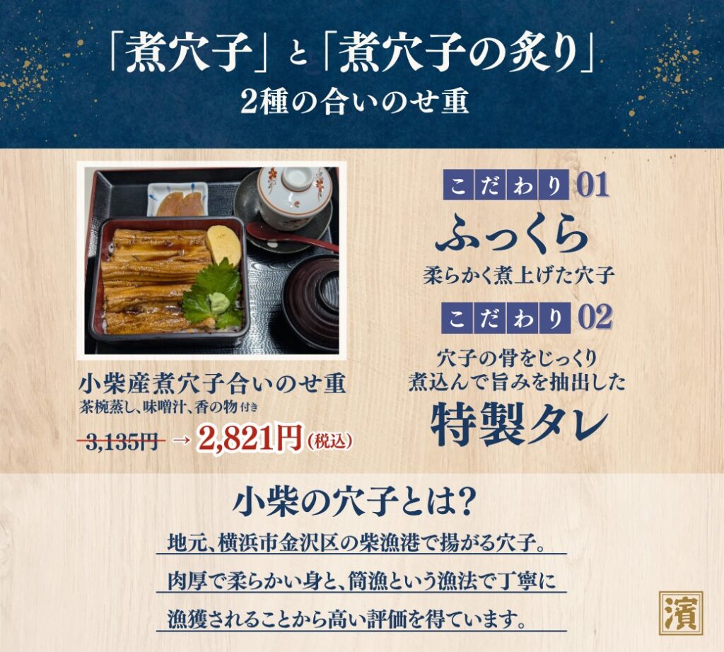 ✔地元横浜・柴漁港の「小柴の穴子」を使用!丁寧に漁獲された肉厚で柔らかい身が絶品です🐟
