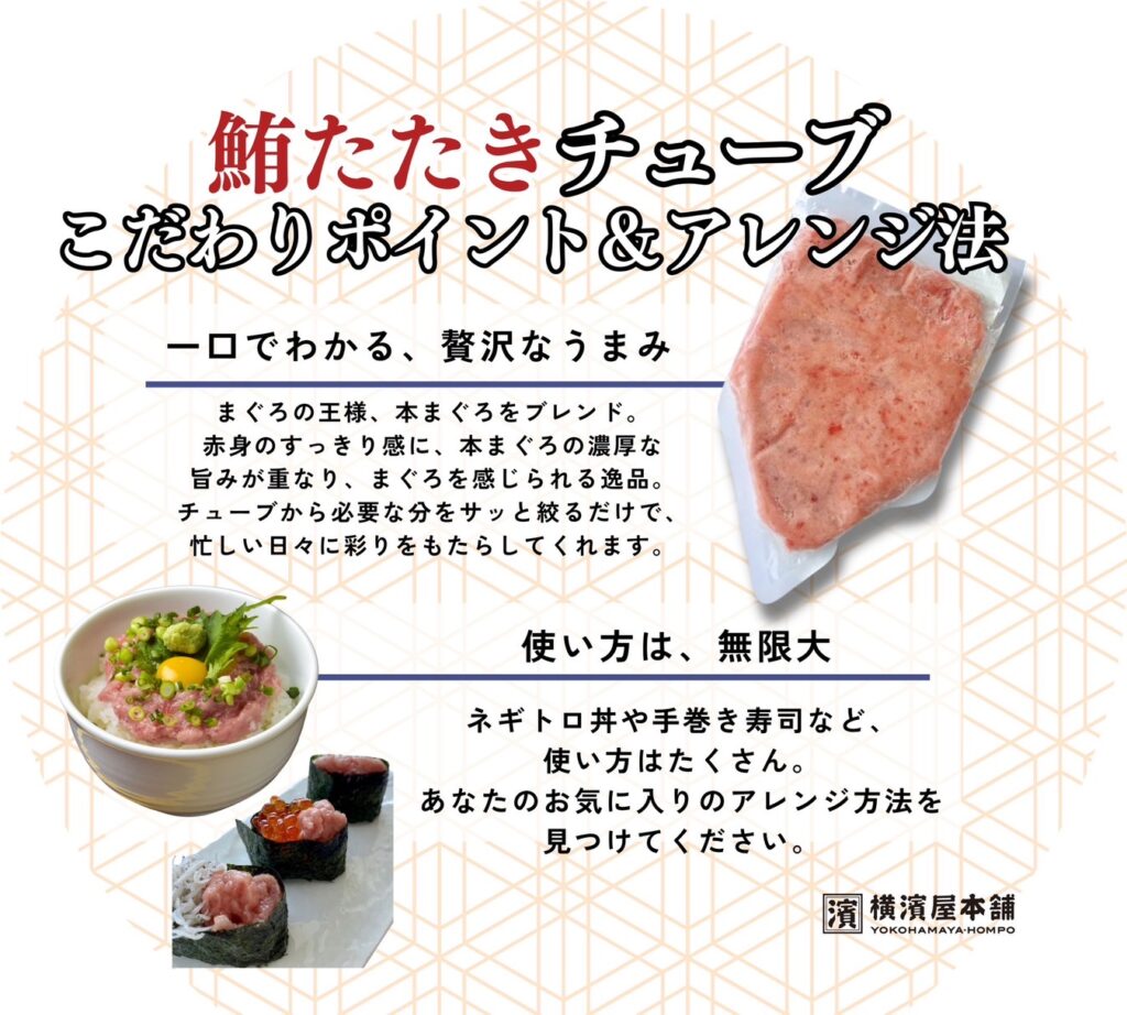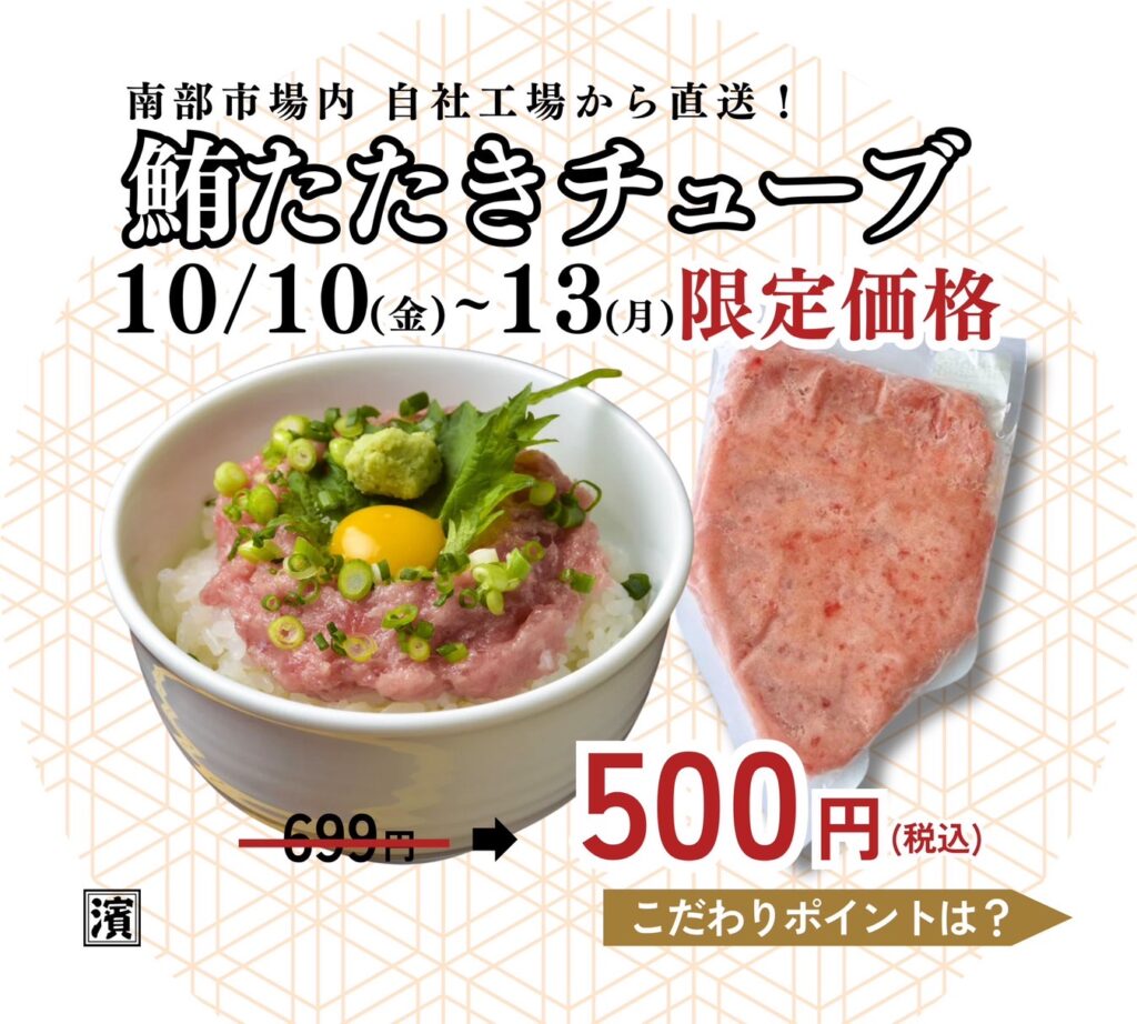 そんな日に合わせて、横濱屋本舗の「鮪たたきチューブ」を 10/10(金)〜13(月)の4日間限定で500円(税込)でご提供します!