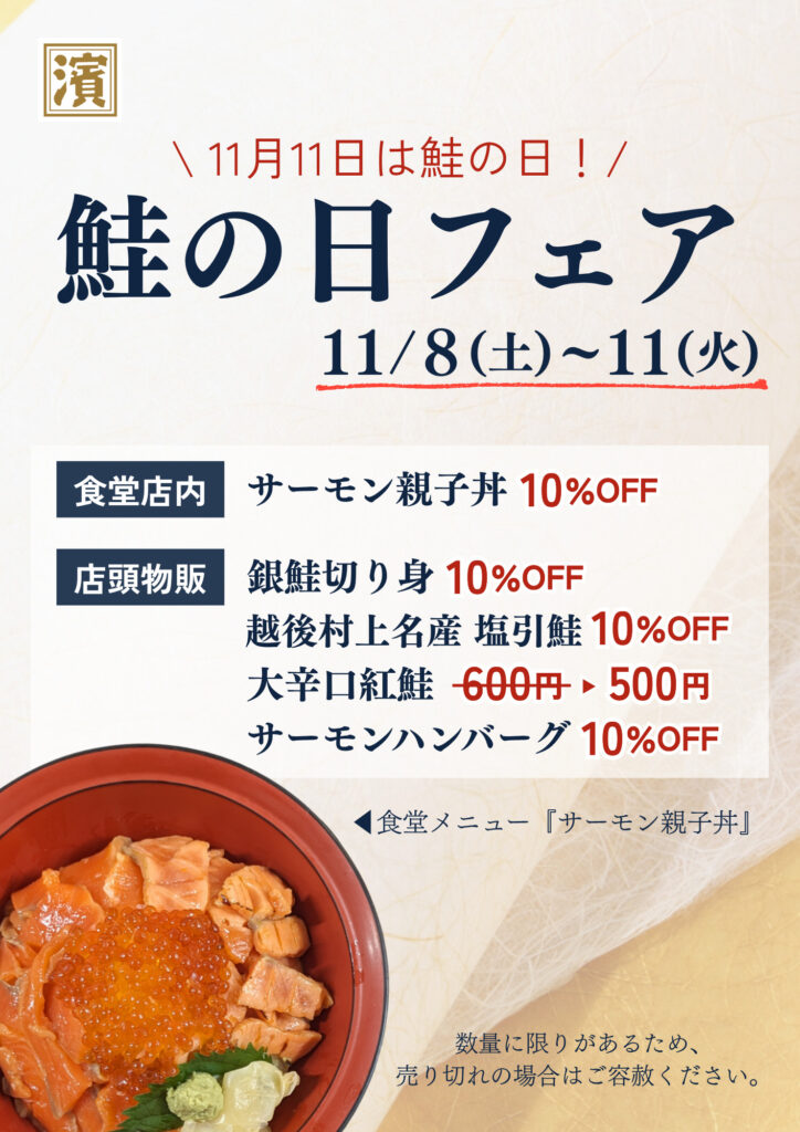 11/8(土)~11(火)の4日間限定で、🎉鮭の日フェア開催!本舗の鮭商品がお得に✨