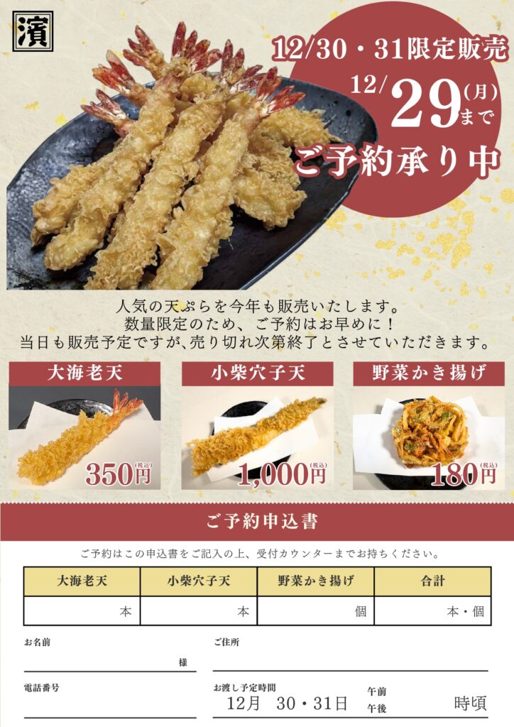 【年末恒例『年越し天ぷら』 予約販売受付中!】